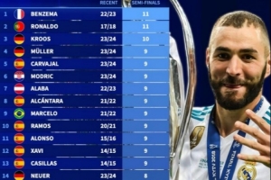 欧冠改制后参加半决赛次数榜:C罗、本泽马11次最多,克罗斯10次